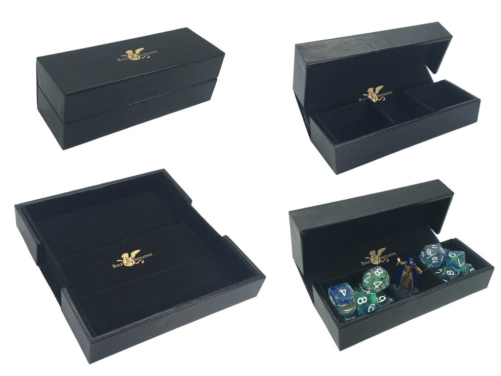 Role 4 Initiative's dice box / rolling tray features a leather look exterior with soft felt interior.   Three separate compartments hold up to 30 dice and/or 3 minis.  Gold foil logos on both interior and exterior give it a touch of class.